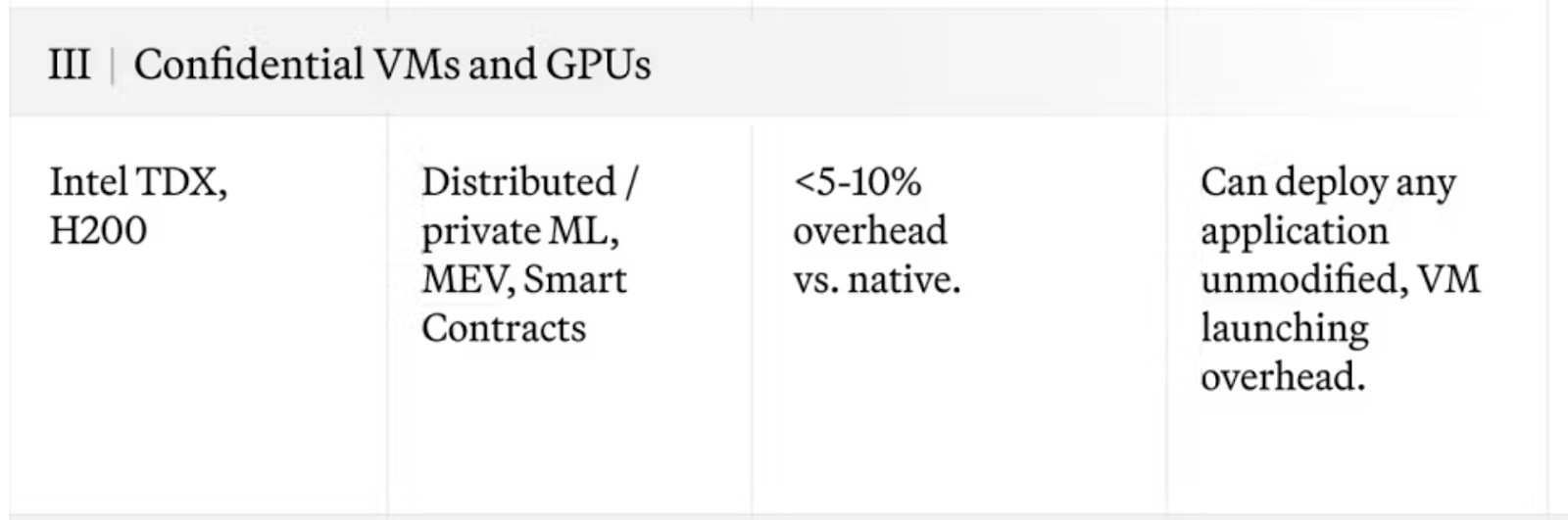 当用例进一步扩大,不仅局限在应用层面,而是上升到系统层面。英特尔 SGX无法满足市场需求,英特尔TDX应运而生。英特尔TDX专为虚拟机设计,甚至英伟达的H100和H200也开始支持TEE,是为AI服务的TEE硬件。
