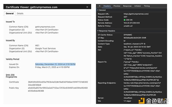 也有人为其充值信仰,软件工程师 cygaar 指出新的特朗普 Memecoin 网站的部署几乎与之前的 NFT 网站完全相同。相同的 cloudflare 设置,相同的 Heroku 部署,相同的 SSL 证书颁发者,HTML 结构也与之前非常相似。且特朗普 Memecoin 网站是经过一番努力才建立起来的,其使用 Cloudflare 保护网站免受 DDoS 攻击,SSL 证书于 2024 年 12 月 21 日颁发,这些足以看出网站已经筹备了一段时间。