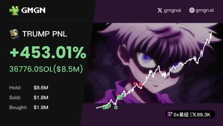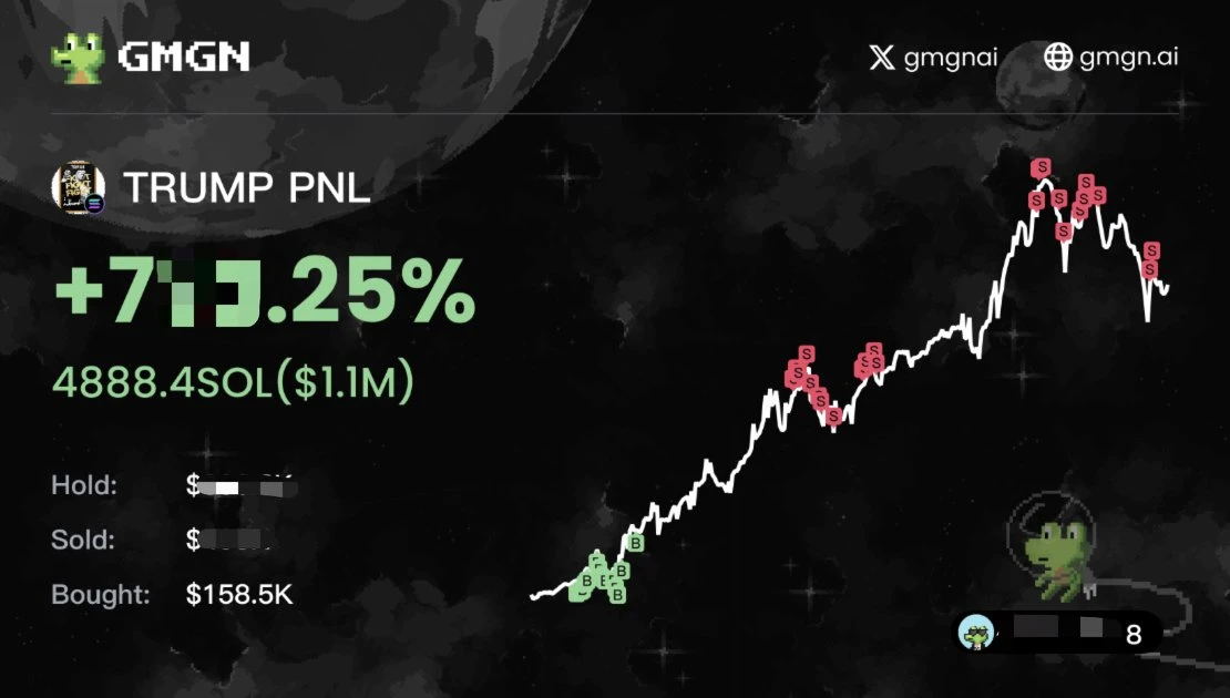 据 0x uezhang 丨 985.eth 本人于发推表示:「第一时间用 gmgn 买上了(TRUMP),这个号靠 20 sol 成功打到了 1000 sol。」据 GMGN 网站信息显示,其盈利规模超 100 万美元。