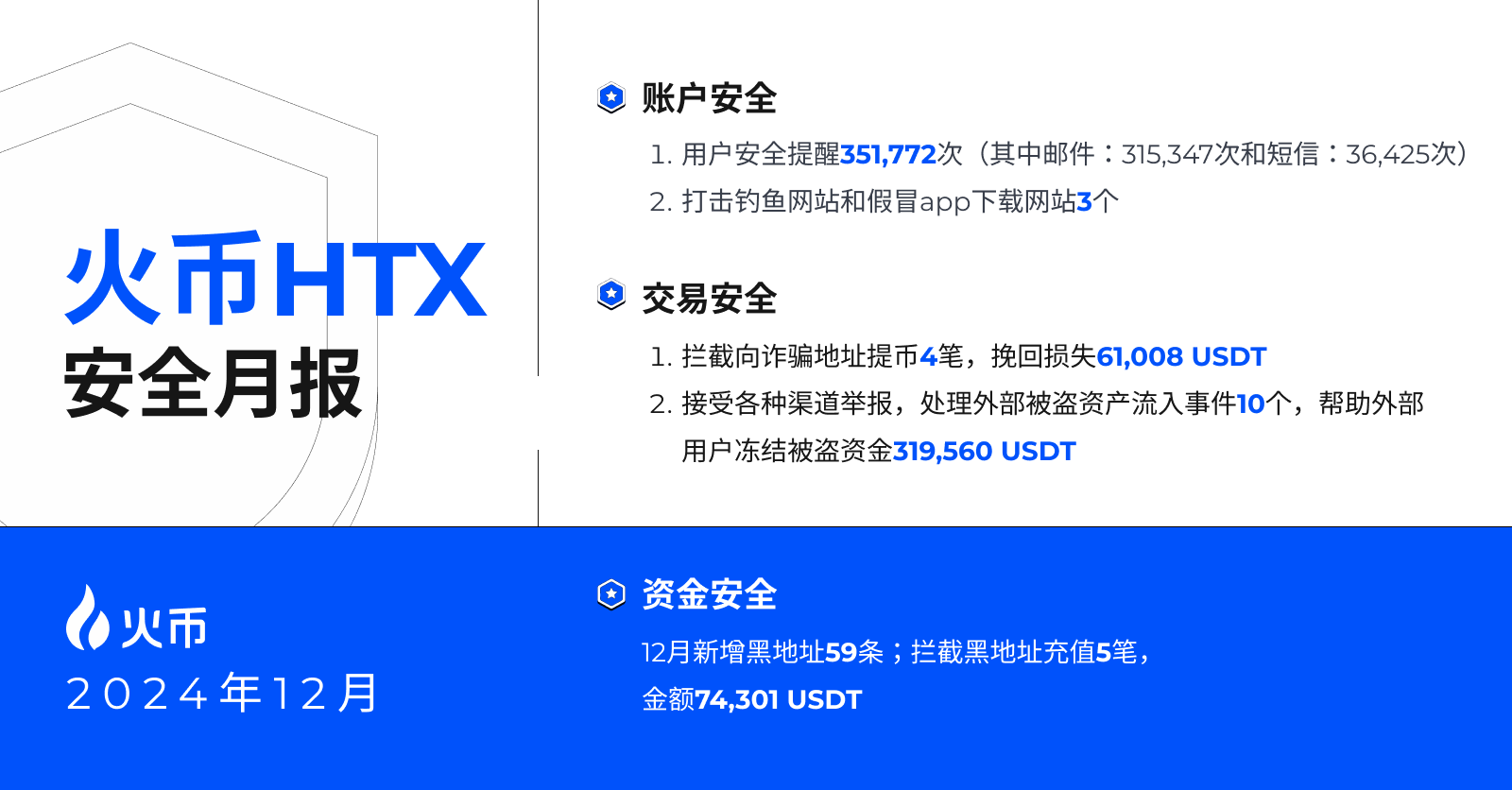 作为全球领先的加密货币交易平台,火币HTX在刚刚过去的2024年,保持了全年0安全事故的出色记录。这离不开平台对安全的高度重视,对风险的时刻警惕,以及对防护体系的不断打磨。自2024年5月起,火币HTX每月公示安全月报,旨在进一步提升平台透明度,强化自身安全服务意识,并履行对用户资产安全的承诺。近日,12月安全月报出炉,用全面提升的数据为火币HTX 2024年的安全工作画上了一个圆满的句号。