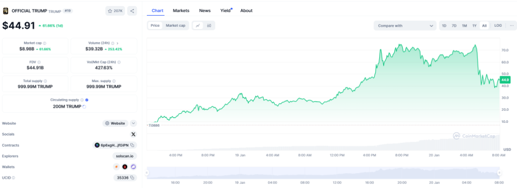 该代币一经推出便大火。CoinGecko 数据显示,「特朗普币」以 0.1824 美元的开盘价开始交易,12 小时内涨超 15000% 至约 30 美元,自推出以来最高升至 75.35 美元(累计涨幅超过 41200%),完全稀释市值(FDV)市值接近 800 亿美元。
