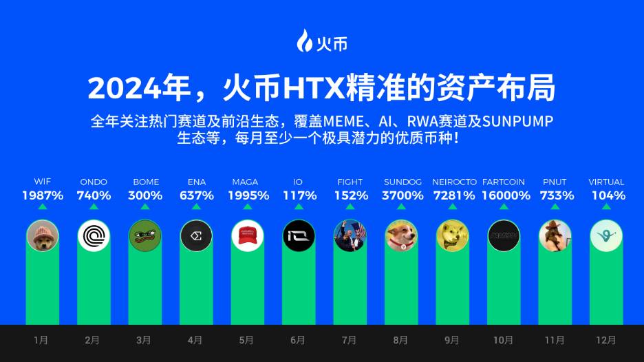 此外,火币HTX平台推出的Meme板块资产也成为用户财富增长的重要渠道。2024年,火币HTX凭借敏锐的市场嗅觉和精准的资产布局,不断为用户创造可观收益。全年关注热门赛道及前沿生态,覆盖Meme、AI、RWA赛道及SunPump生态等,每月都有极具潜力的优质币种上线,并分别取得了不俗涨幅: