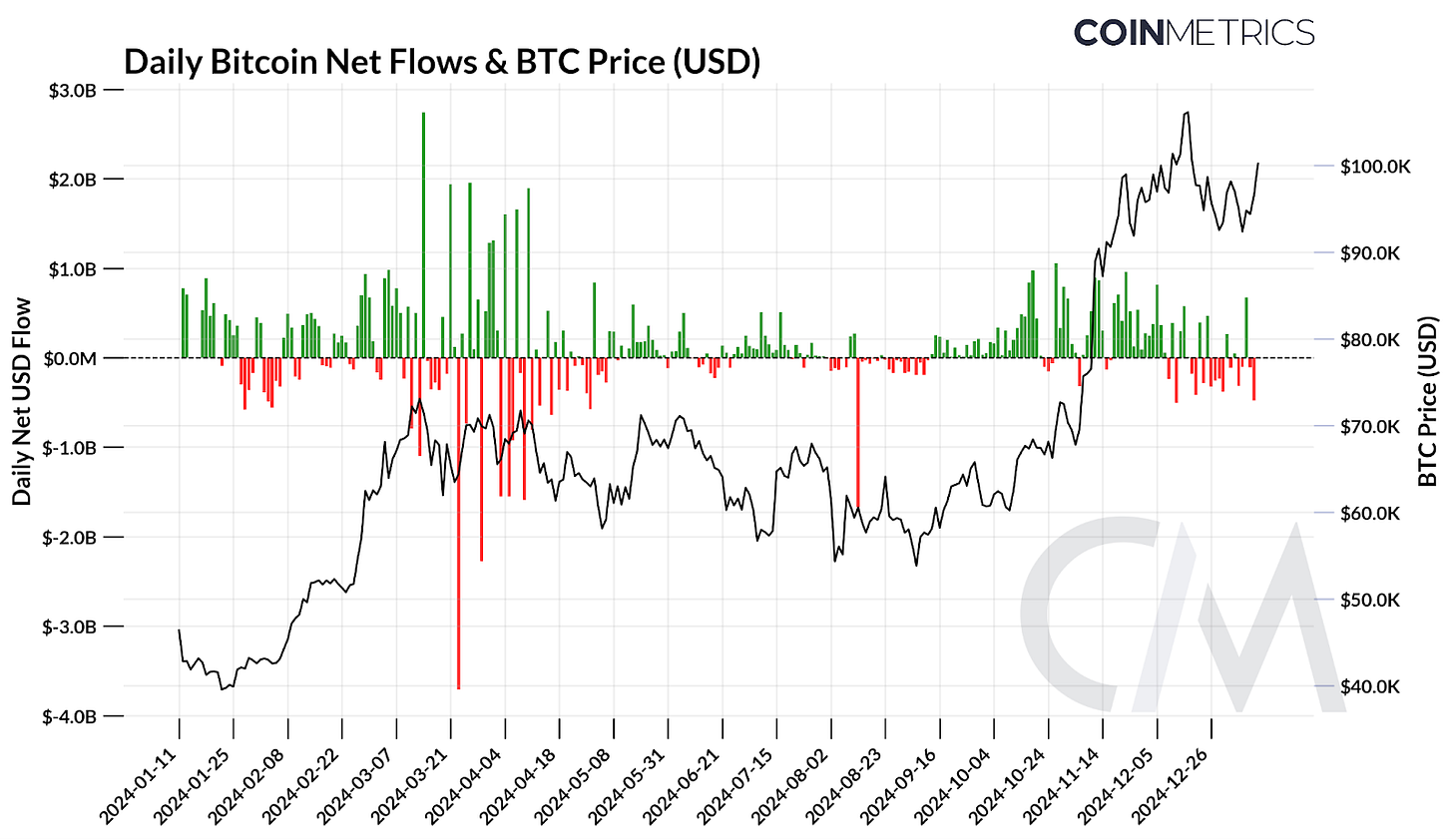 通过分析 12 个月的数据,我们可以开始了解现货比特币 ETF 净流量与 BTC 价格之间的相互作用。作为 BTC 结构性需求的庞大而稳定的来源,现货 ETF 对价格走势产生了可衡量的影响,尽管随着时间的推移会有所变化。下图显示,大量流入或流出与主要价格走势同时发生。然而,这种关系并不一致,因为除了MicroStrategy 的市场影响等因素外,更广泛的市场条件和投资者情绪也发挥了作用。