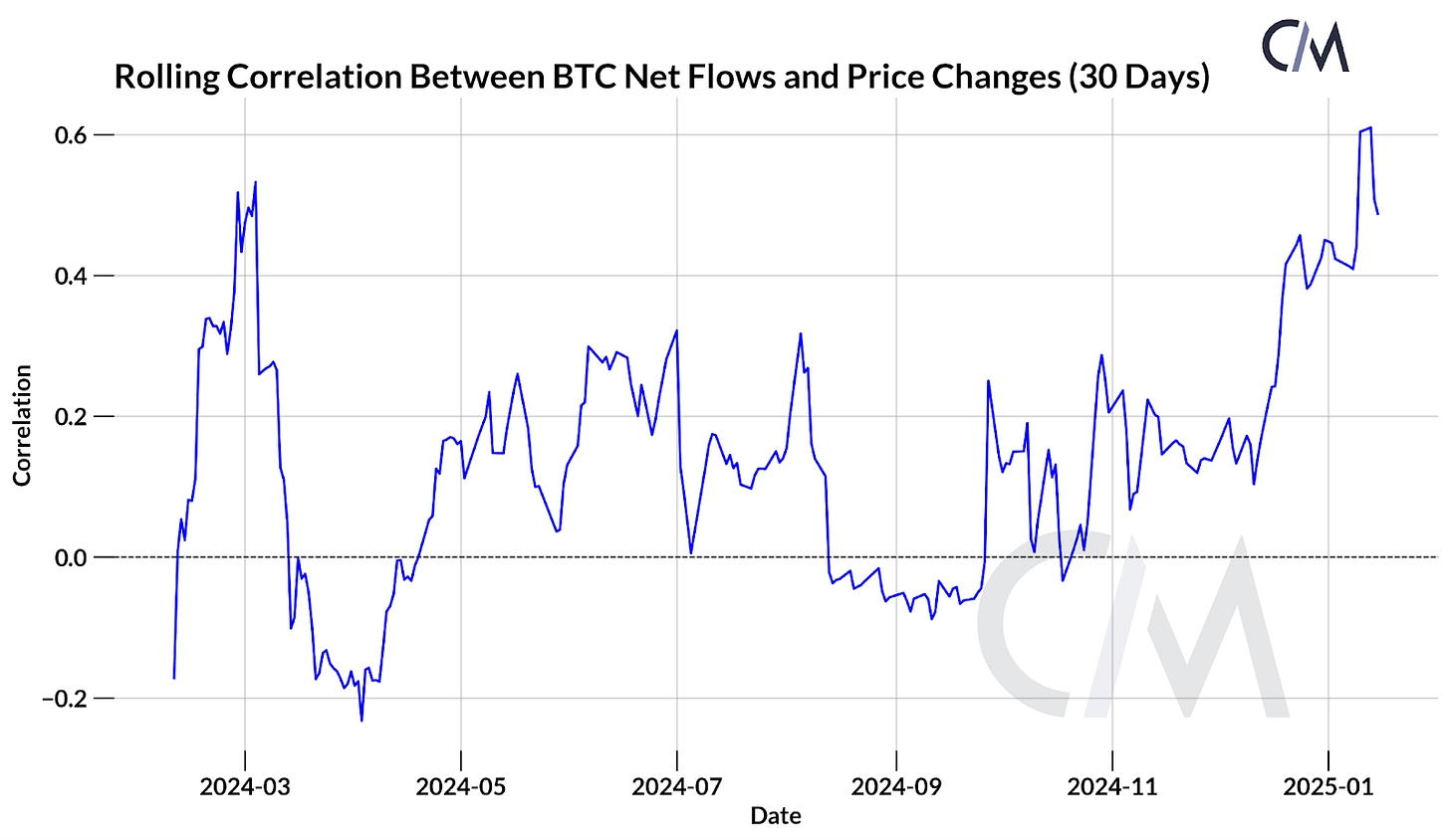 滚动相关图突出显示了 ETF 净流量与 BTC 价格变化之间不断变化的关系。在市场势头强劲或资金流入量显著的时期,相关性往往会增强,这表明随着发行人积累 BTC 以满足需求,ETF 流入可以成为 BTC 价格上涨的结构性驱动因素。相反,随着散户和机构投资者将资金分配给 ETF,形成一个强化反馈循环,BTC 价格上涨可以吸引更多资金流入。
