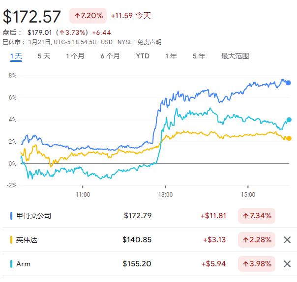 特朗普官宣重大AI项目,计划斥资5000亿美元,甲骨文、英伟达、Arm股价全线上涨。