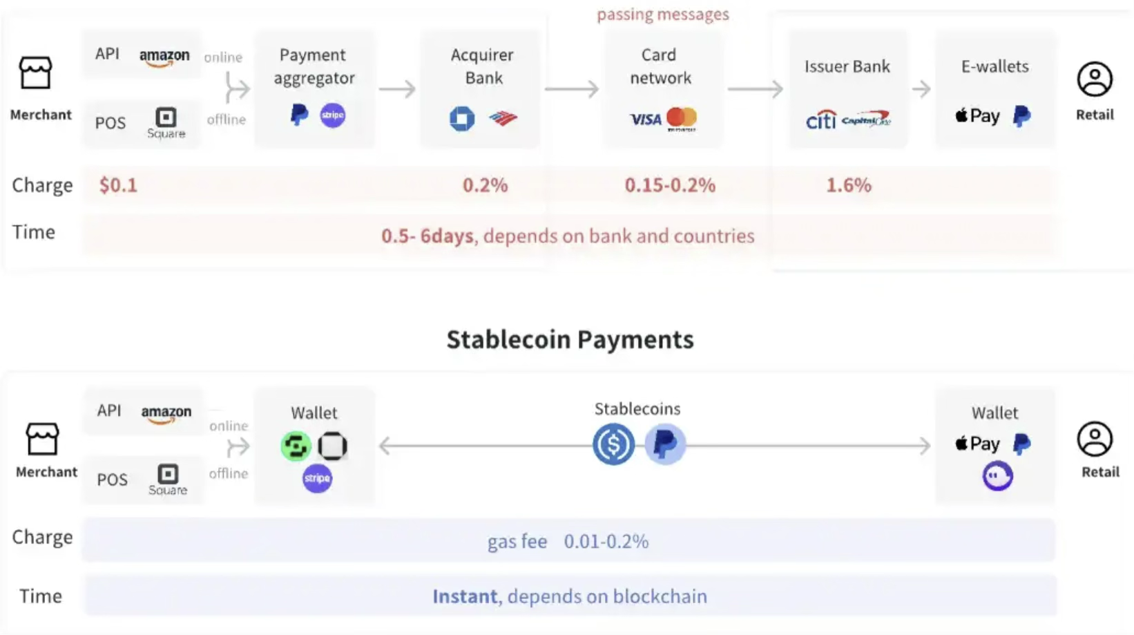 与传统金融和支付体系类似,构建可防御且可扩展的护城河是各个层级实现商业机会最大化的关键。随着时间推移,堆栈的各层将逐渐整合,而 商户层 最具聚合潜力,能够将其他层级打包提供给用户,进一步提升价值、增加利润来源,并掌控外汇交易、出入通道选择和稳定币发行商的合作,从而构建一个全面、高效的跨境支付解决方案。
