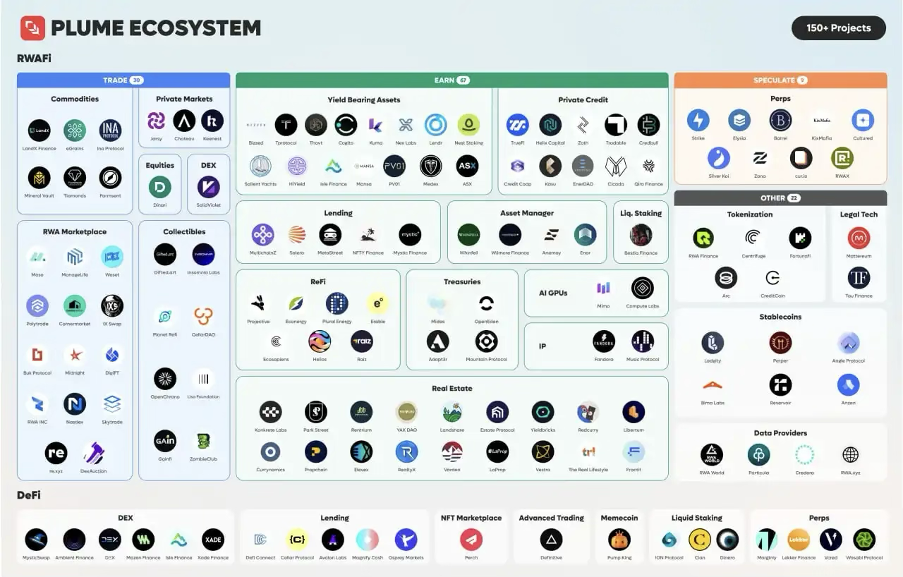 Plume 是一个专注于 RWA 的 Layer2 生态系统,致力于将传统金融 (TradFi) 与去中心化金融 (DeFi) 融合,打造金融生态网络,涵盖 180 多个项目,并通过企业以太坊联盟 (EEA) 和代币化资产联盟 (TAC) 与 WisdomTree、Arbitrum、摩根大通、a16z、Galaxy Digital 和 Centrifuge 等机构建立战略联盟,推动行业标准和机构级 RWAfi 解决方案的落地。
