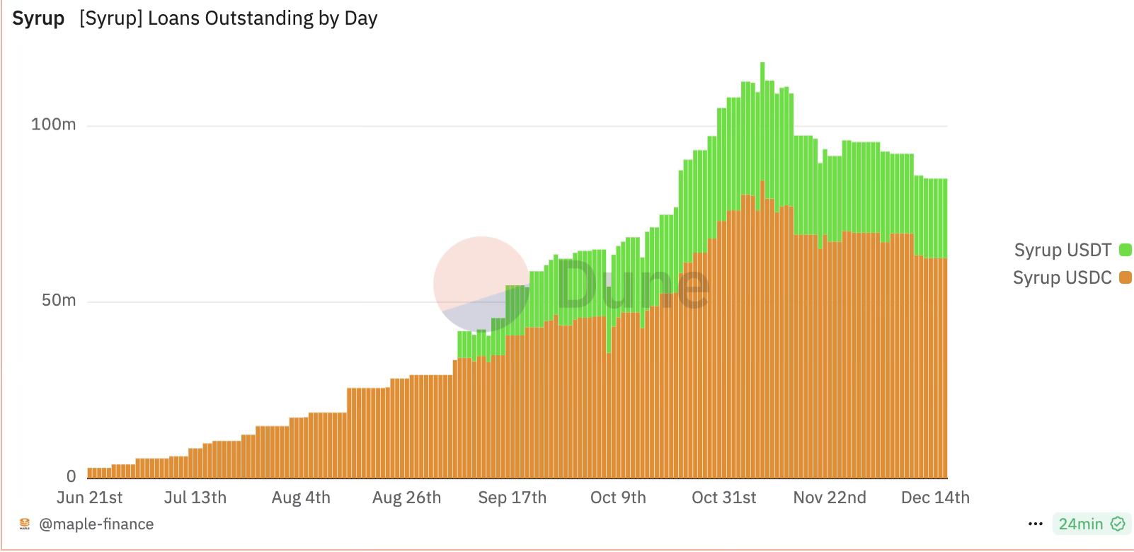 Maple 于今年 5 月推出的项目 Syrup 也依靠 DeFi 玩法实现快速增长,助力 Maple 在经历熊市贷款违约后重获新生。