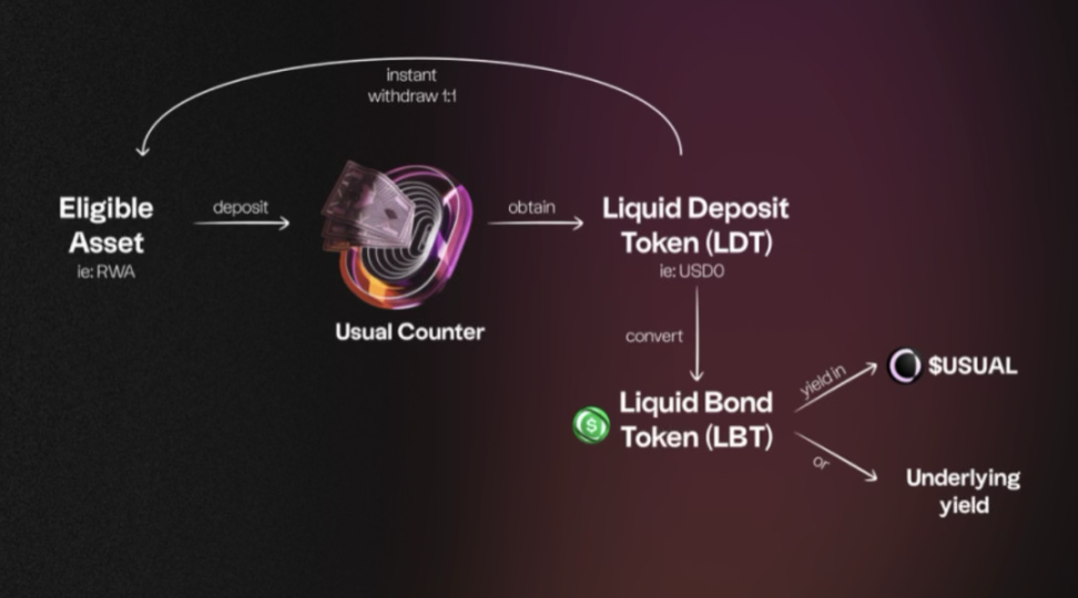 Usual Protocol 推出的稳定币 USD0,通过将美国国债等传统金融资产代币化,提供了两种铸造方式:用户可以通过直接存入 RWA 资产或通过存入 USDC/USDT 间接铸造 USD0,同时还可将 USD0 升级为收益更高的 USD0++,并通过与 DeFi 平台如 Pendle 的合作,为用户提供额外的忠诚度奖励。