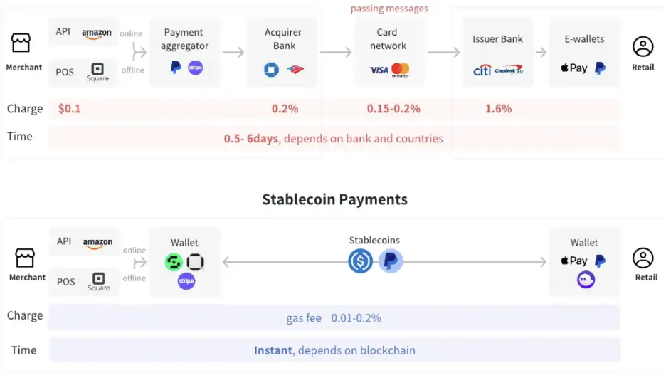 与传统金融和支付体系类似,构建可防御且可扩展的护城河是各个层级实现商业机会最大化的关键。随着时间推移,堆栈的各层将逐渐整合,而 商户层 最具聚合潜力,能够将其他层级打包提供给用户,进一步提升价值、增加利润来源,并掌控外汇交易、出入通道选择和稳定币发行商的合作,从而构建一个全面、高效的跨境支付解决方案。