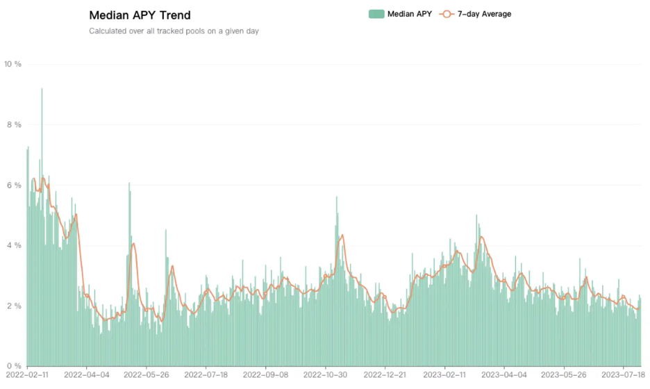 三箭资本暴雷后,加密行业暴露出一个关键问题:资产缺乏可持续收益场景。随着美联储开启加息进程,全球市场流动性紧缩,定义为高风险资产的加密货币受冲击尤为明显。而与之对比,现实世界资产(如美债)的收益率自 2021 年底以来稳步上升,吸引了市场关注。2022 年至 2023 年,DeFi 收益中值从 6% 降至 2%,低于同期美债无风险收益的 5%,使高净值投资者对链上收益失去兴趣。在链上收益枯竭的情况下,行业开始转向 RWA,希望通过引入链下的稳定收益重新激发市场活力。
