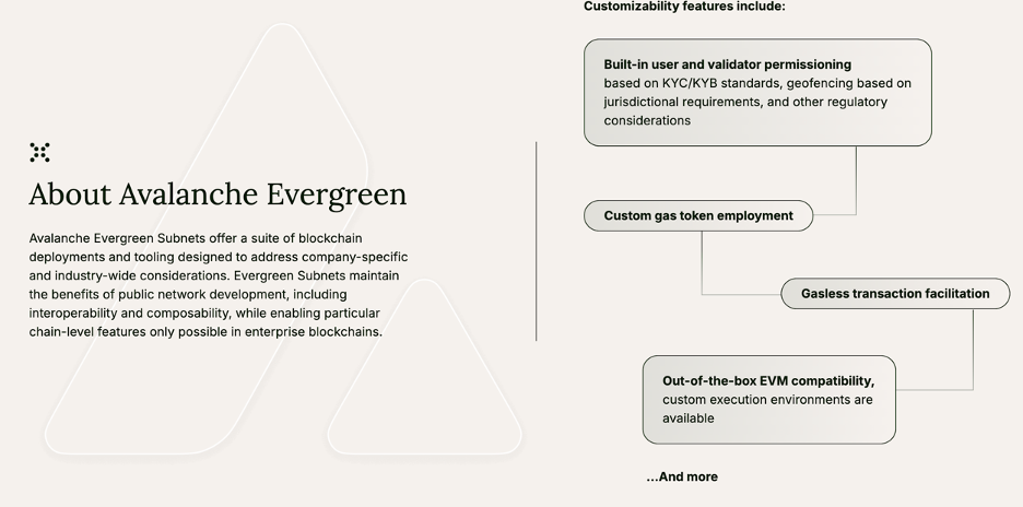 Avalanche 则是首个全面拥抱 RWA 的 L1 公链,自 2022 年底开始高频探索企业级应用,凭借其独特的子网架构,帮助机构部署针对特定用例优化的自定义区块链,并实现与 Avalanche 网络的无缝互操作,具备不受限制的扩展性。2022 年底至 2023 年初,韩国、日本和印度的文娱巨头相继在 Avalanche 上构建子网。Avalanche 也敏锐地观察到香港在资产代币化领域的动向,2023 年 4 月在香港 Web3.0 峰会上推出 Evergreen 子网,为金融机构提供专门的区块链部署工具和服务,支持在私有链上与经过许可的交易对手进行区块链结算,并通过 Avalanche 本地通信协议(AWM)保持互操作能力,吸引 WisdomTree、Cumberland 等机构加入测试网 Spruce。