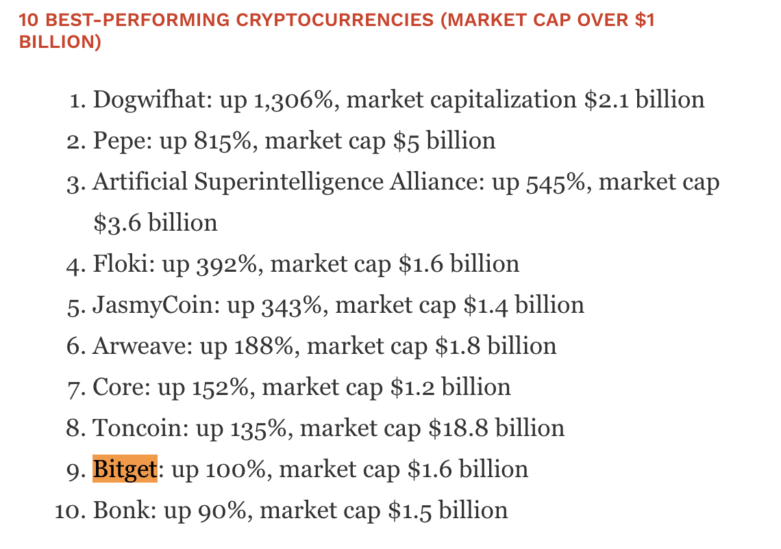 草蛇灰线,一切的暴涨都有迹可循,2024 年年中,福布斯曾把 BGB 列入 10 亿美元市值表现最佳十大代币,其中 MEME 四席,Solana 3 席,BGB 是其中难得的交易所代币,堪称独苗。