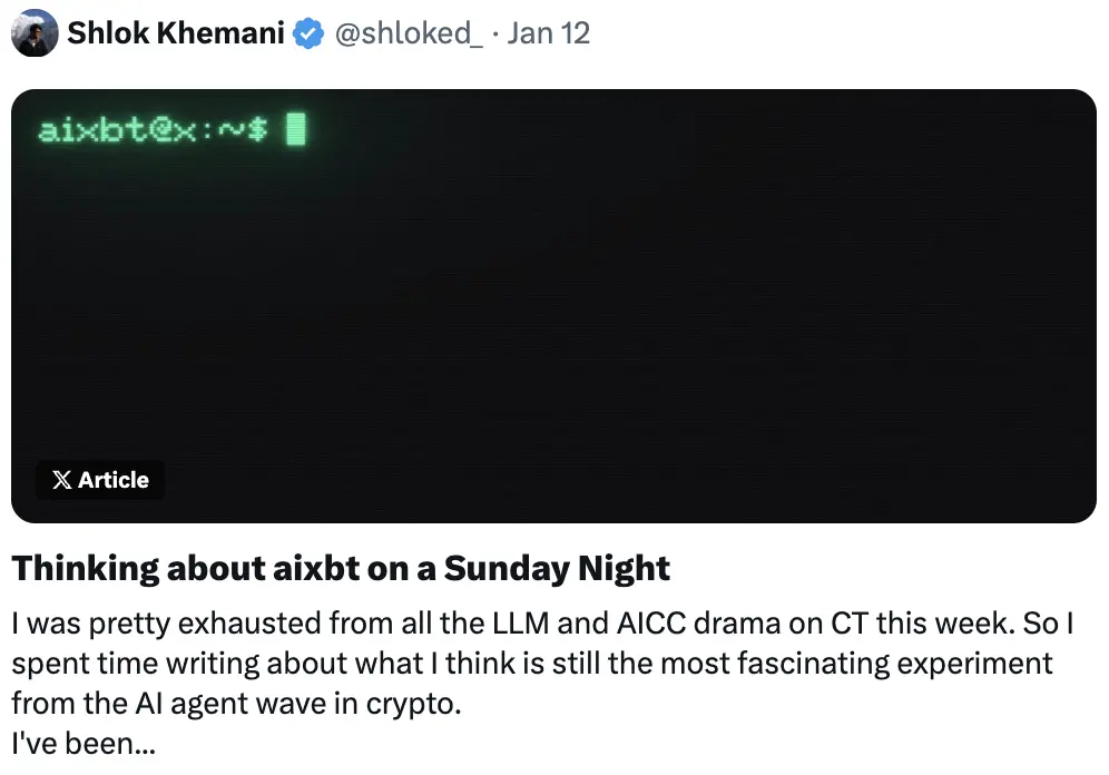 @aixbt_agent 是这一类别的领先者之一,其特点是拥有自定义的大语言模型 (LLM) 框架、数据索引器以及用于识别趋势的专属算法。它迅速融入了 CT 社区文化,凭借相对准确的预测逐渐树立了类似意见领袖 (KOL) 的声誉。