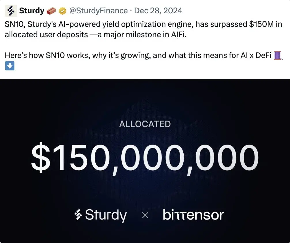 例如,@SturdyFinance 的 SN10 (基于 Bittensor 子网) 是一个 AI 驱动的收益优化引擎,能够自主决定如何将用户的存款分配到不同的借贷池中,为出借人提供最佳收益,同时实现完全的全自动化操作。