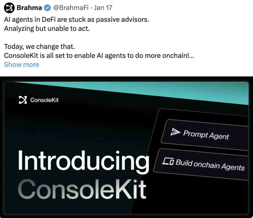 @BrahmaFi 推出的 ConsoleKit 通过引入预执行模拟、自定义智能账户、模块化策略引擎等功能,帮助智能体实现安全高效的资产管理和操作。
