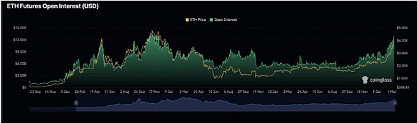 根据Coinglass的数据,ETH期货未平仓合约已突破130亿美元,截至发稿时,处于2021年11月以来的最高水平。