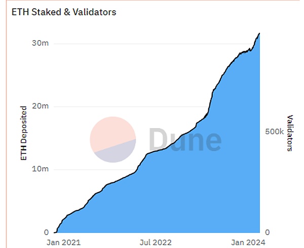 另一方面,以太坊链上质押和验证者数量也在不断增长。据Dune Analytics数据显示,本文撰写时以太坊信标链的总质押量已经超过3100万枚ETH,触及31,664,744 ETH,按照当前价格计算约合1266.58亿美元,网络验证者数量接近99万个,均创下历史新高。不仅如此,自从上海升级之后以太坊链上净流入规模已经接近1170万枚ETH,数据表现相当“可观”。