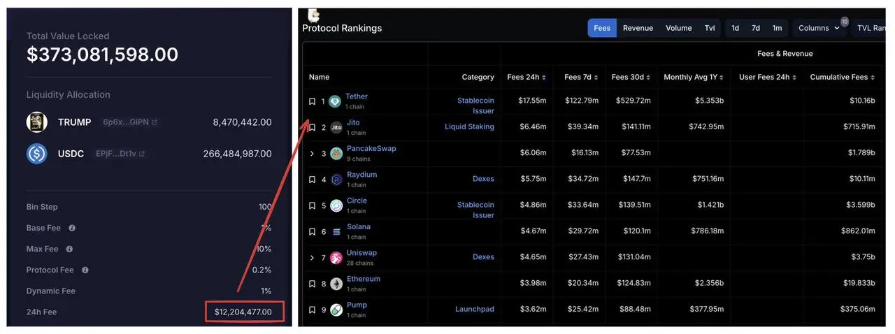 由于 DLMM 的机制,Trump 团队是该主流动性池的创建者,提供了最初的单边流动性,作为 Creator 也能获得交易手续费。事实上,Trump 团队仅在代币推出当天的 LP 手续费收入就超过 4000 万美元。