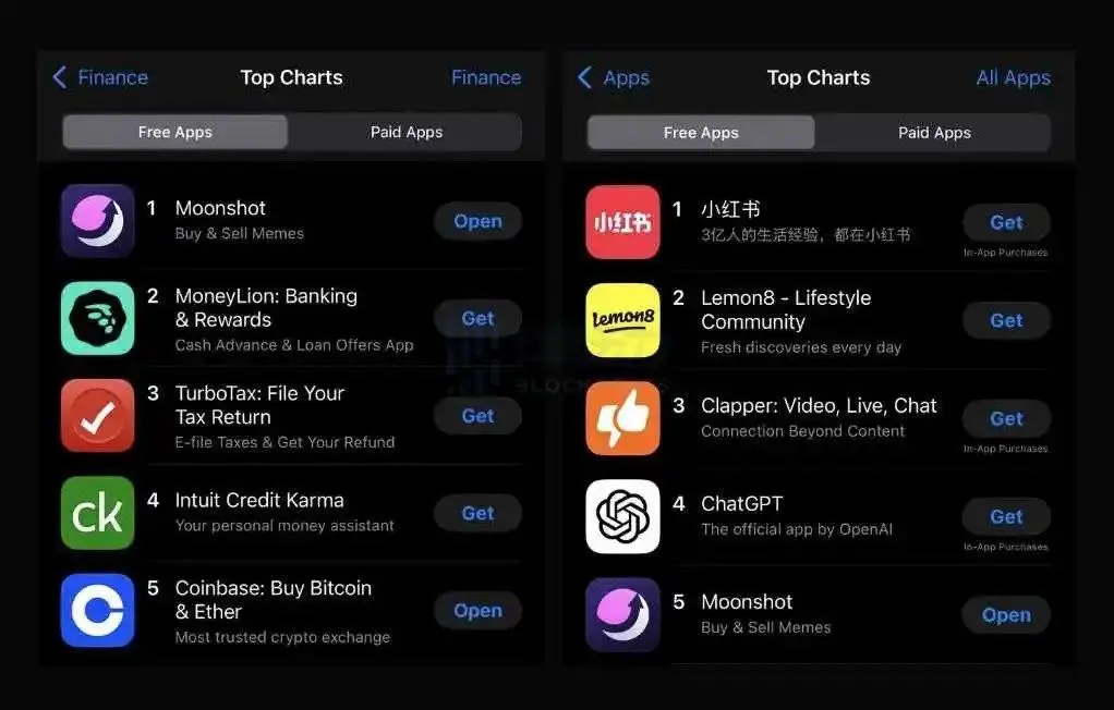Moonshot 是一个 Meme 币交易平台,以散户多、入金简单(支持信用卡、Apple Pay 等)、有上币效应著称。在 TRUMP 发币事件后,一跃成为美区 App Store 最受欢迎金融应用之一,是名副其实的「散户入场通道」。