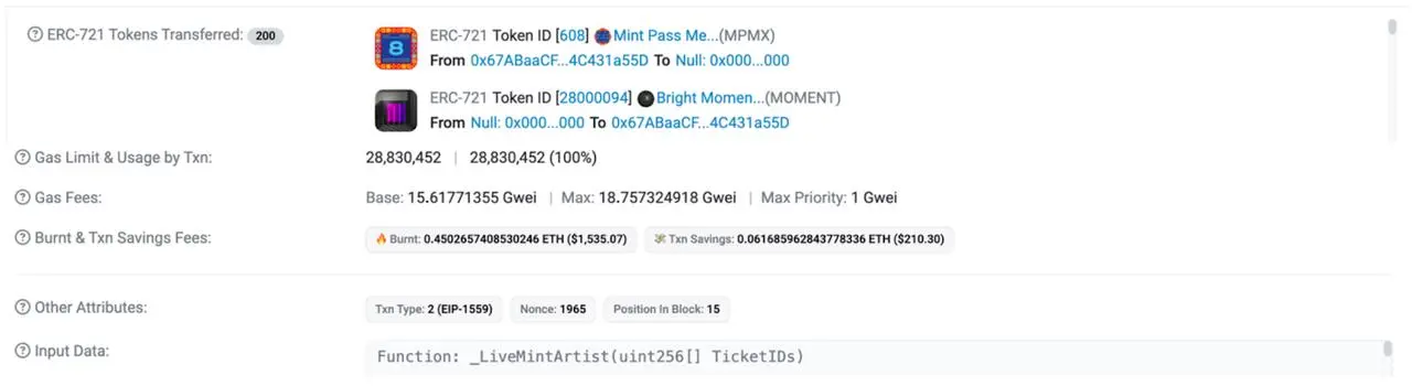 例如,需要大量 Gas 的交易(NFT 批量铸造、大规模代币空投或 DAO 活动),通常接近或超过当前的 3000 万 Gas 上限。这些交易通常分散在多个区块中,导致效率低下、交易延迟和潜在的漏洞。下图中显示的一个具体示例是 NFT 批量铸造交易,消耗超过 2800 万 Gas。
