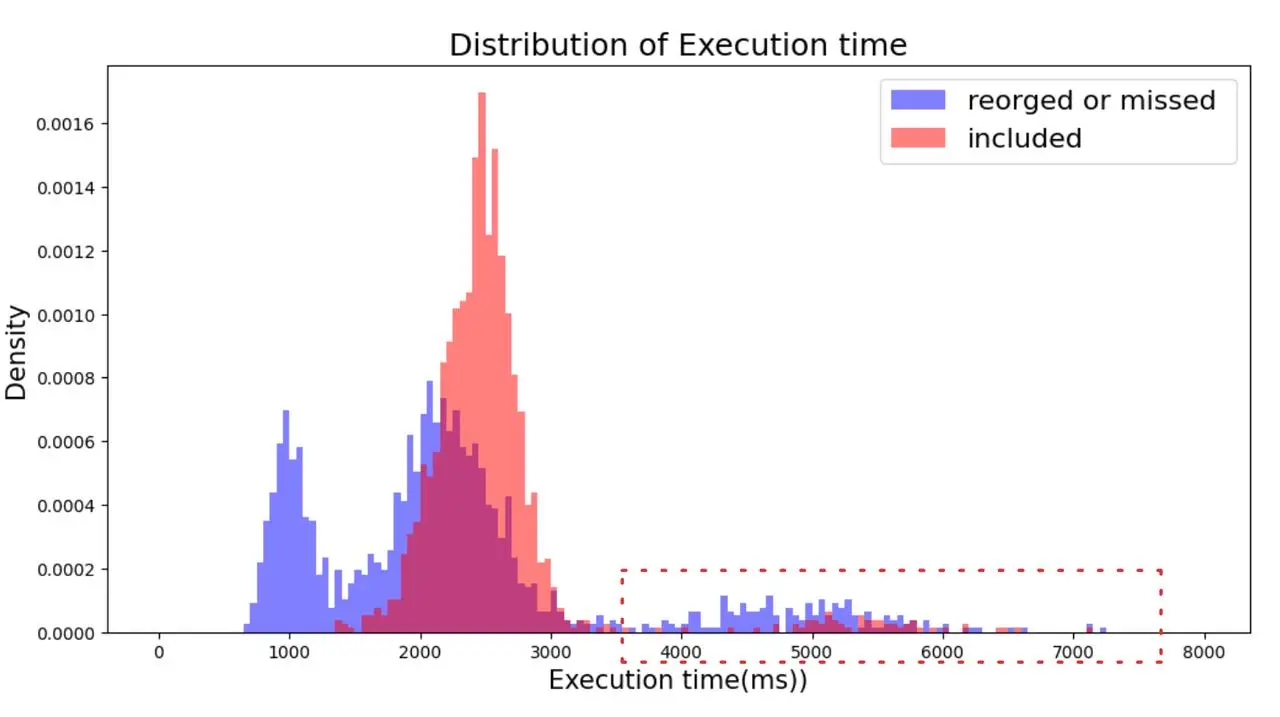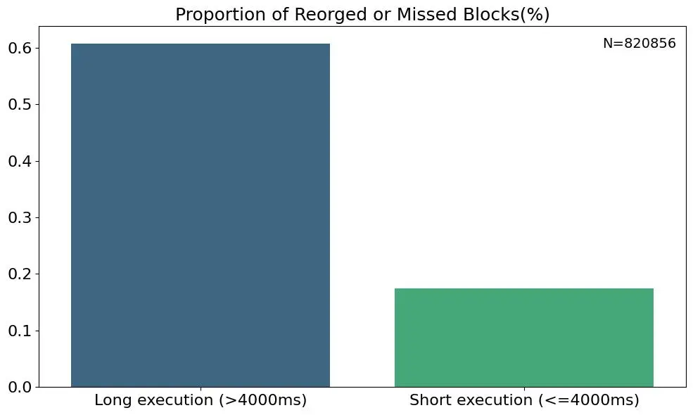 上图中的红色方框强调,执行时间超过 4000 毫秒的 slot 与执行时间较短的 slot 相比,更容易发生重组或遗漏。虽然大多数重组或遗漏的 slot 发生在 1000~3000 毫秒之间(表明在这个范围内执行时间与重组概率之间的相关性较弱),但红色方框中的区块显示,当执行时间超过 4000 毫秒时,重组的可能性明显更高。另一图表中通过显示执行时间超过 4000 毫秒的 slot 的重组或遗漏率,比 4000 毫秒以下的 slot 高出三倍以上,进一步强调了非常高的执行时间对稳定性的影响。