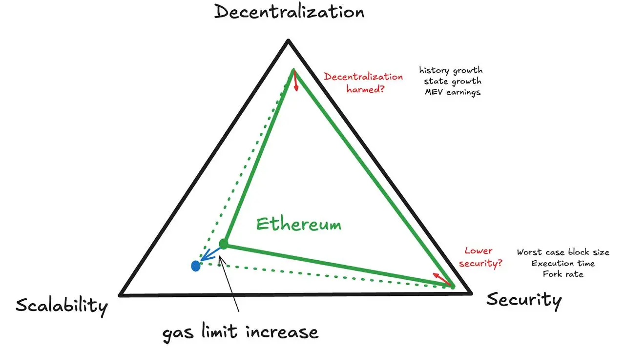 增加 Gas 上限从根本上讲是为了提高以太坊的可扩展性。在区块链「不可能三角」困境的背景下,实现更高的可扩展性往往以牺牲去中心化或安全性为代价。这就是为什么提高 Gas 上限的提议引发了一些质疑,人们担心这可能会通过提高验证者要求而导致中心化,或者通过降低共识层的稳定性而削弱安全性。