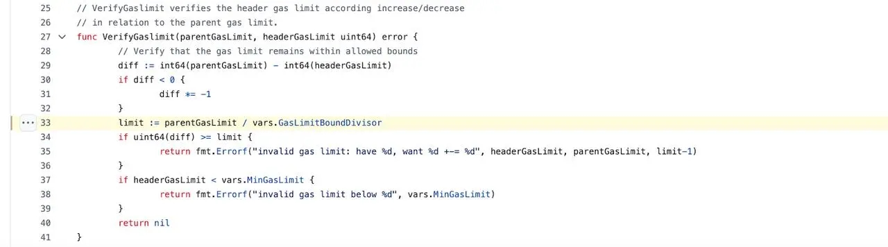 下面的代码展示了在 geth 客户端中以太坊节点的默认行为:如果新区块的 Gas 上限相对于其父区块(Parent Block)在可接受范围内,则它将被视为有效。