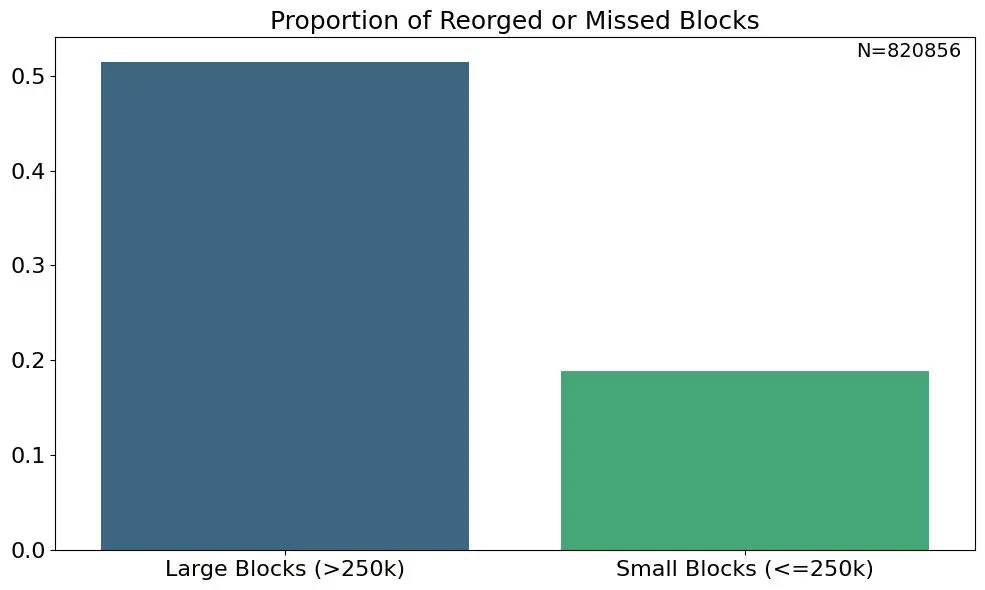 同样,实际区块大小(通常填充交易数据的区块大小)与重组或遗漏 slot 的概率相关。分析 slot 数据(#9526972 至 #10351782)表明,对于较小的区块,包含 slot 与重组 / 遗漏 slot 之间的区块大小分布差异很小。然而,随着区块变大(例如,超过 0.25MB),发生重组或遗漏 slot 的可能性就会增加。