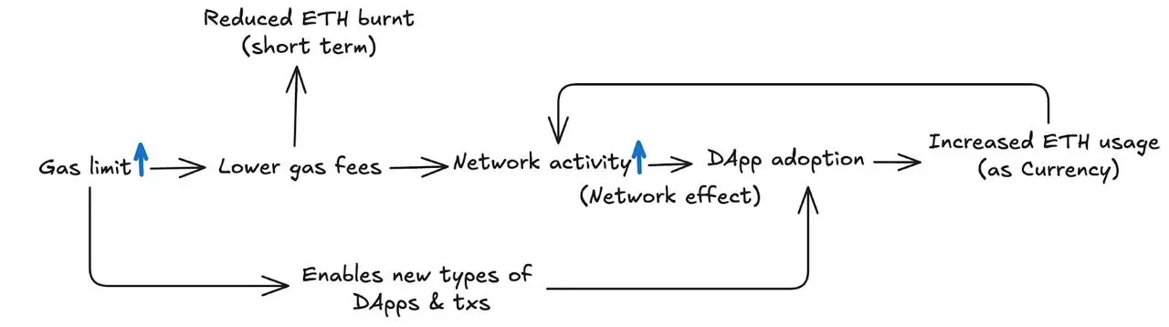 让我们先来看看 Gas 上限增加的一些相对可预测的影响。区块容量的增加将使处理当前区块链需求变得更容易,从而降低 Gas 费用。