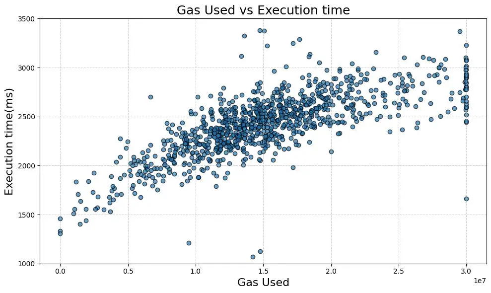 下图显示,随着区块中使用更多的 Gas,执行时间趋于增加。预计 20% 的 Gas 上限增加会略微延长执行时间,但具体影响难以预测。执行时间并不总是与最大 Gas 上限或 Gas 使用量直接成正比。但是,如果我们根据图表做出保守的比例假设,认为它们成正比,那么执行时间增加 400~500 毫秒似乎是合理的。