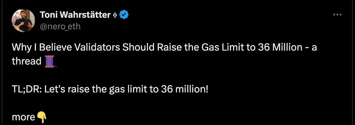 就在最近,一个提案更是提出「雄心勃勃」的目标:将 Gas 上限翻倍至 6000 万。当然,6000 万主要被视为一个长期目标,而非即时目标。2024 年 12 月,Toni Wahrstätter 则建议采取更为谨慎的方法,主张先将 Gas 上限增加到 3600 万(增长 20%)作为更安全的第一步。