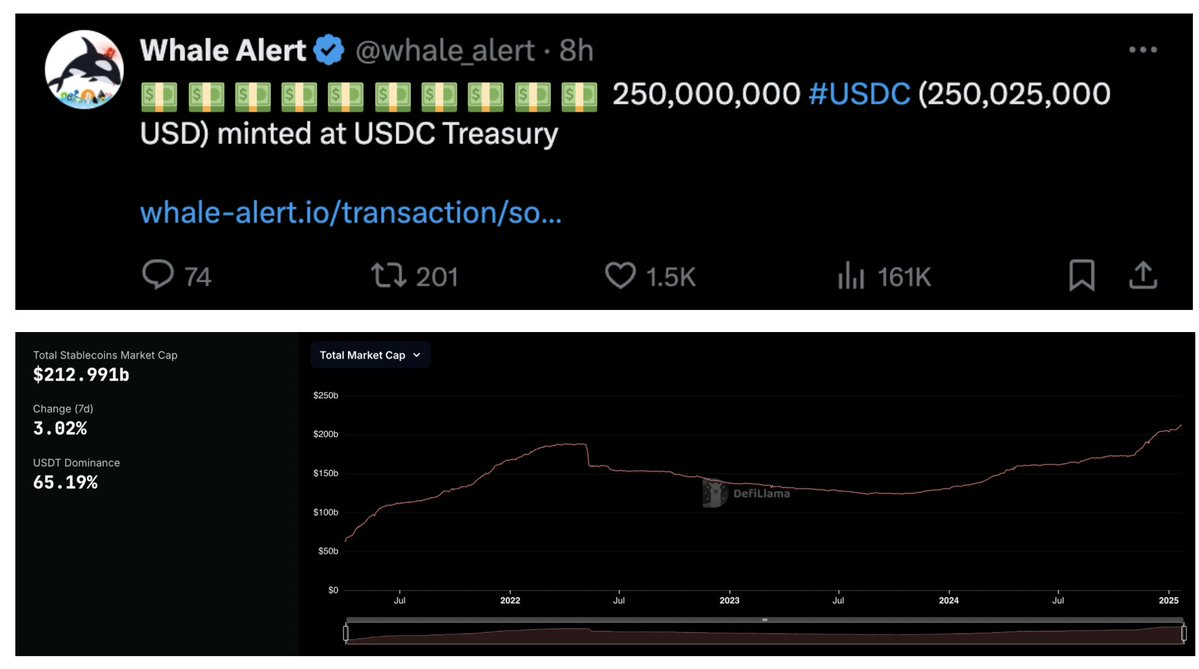 另一个积极信号是稳定币供应持续增长。从历史数据来看,稳定币供应的增加往往是机构兴趣和市场流动性增强的可靠前兆。值得思考的是:究竟是谁在如此大规模地铸造这些稳定币?