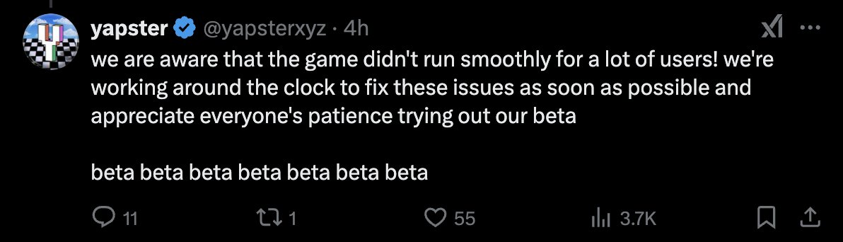 @yapsterxyz:我们了解到许多用户在游戏运行时遇到了卡顿和其他问题!目前我们正在夜以继日地修复这些问题,争取尽快解决。非常感谢大家在体验 Beta 测试版时的理解和耐心。