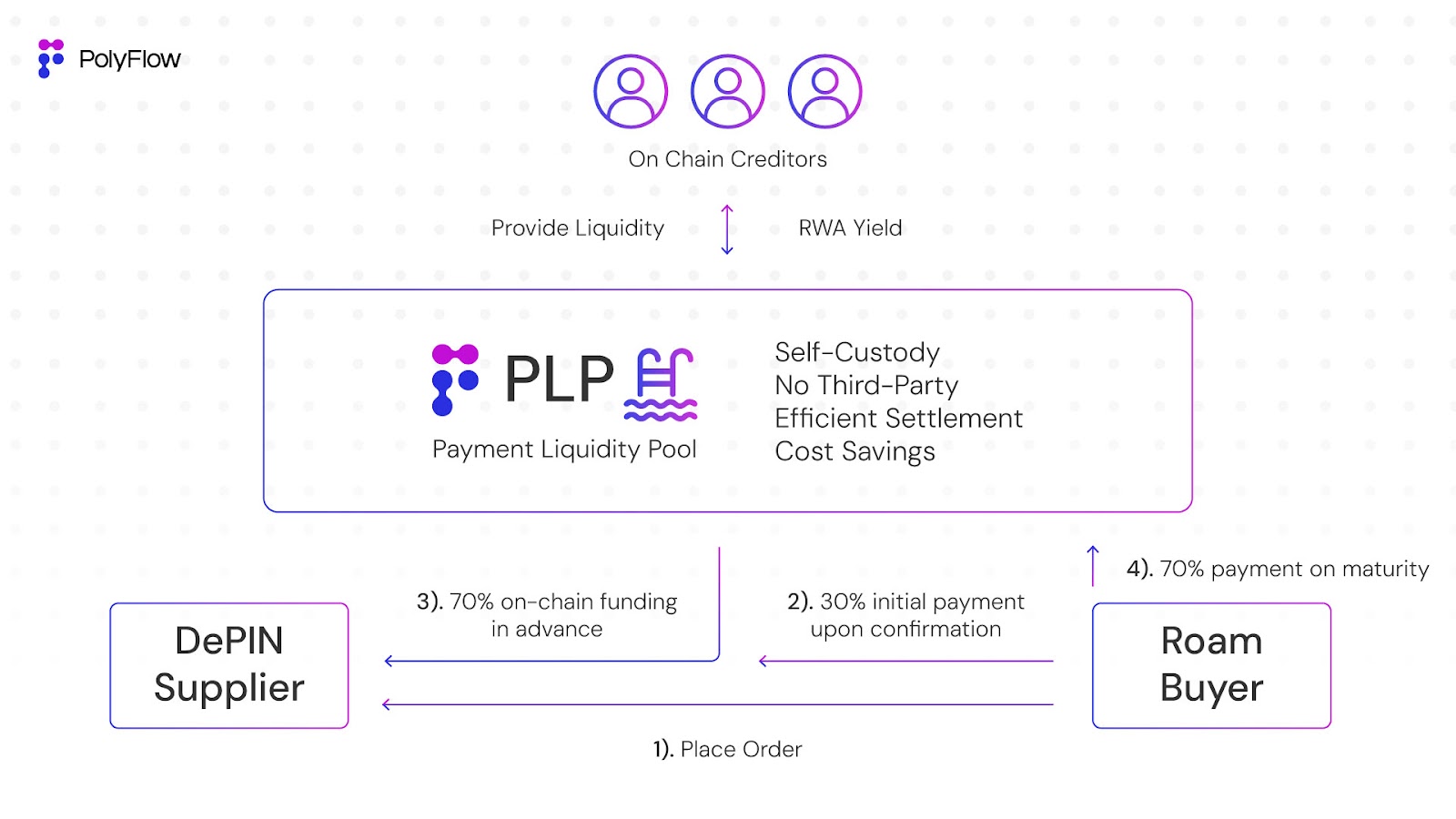 解决方案:PolyFlow通过其支持的代币化供应链金融平台在区块链上对Roam的订单进行代币化。这种方法利用链上流动性,根据Roam的订单为供应商筹集资金,满足其融资需求。
