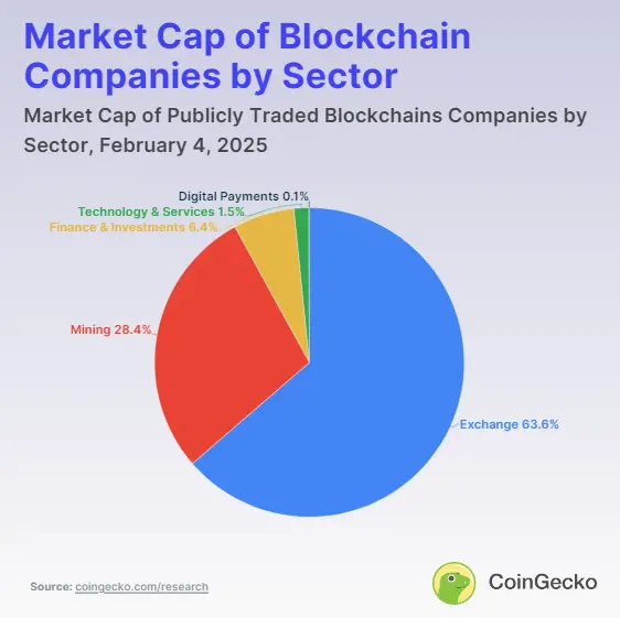 数据截至 2025 年 2 月 3 日。为了确定上市公司的数量和市值,我们使用了北美场外交易和机构交易所的公开数据。加拿大交易所主要持有 ETF,这些 ETF 被排除在外,因为它们不是以公司结构构建的,而是以投资基金结构构建的。尽管与美国交易所有重叠,但 Galaxy Digital 是唯一值得注意的例外,因为它是一只非低价股,股价远高于每股 5 美元。