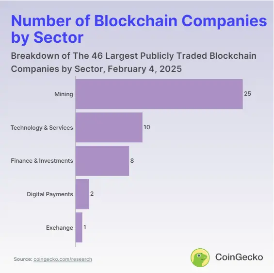 可以预见的是,在 46 家最大的上市区块链公司中,大多数专注于加密货币挖矿业务,占 25 家公司。尽管一些公司已经将业务范围从挖矿扩展到人工智能和 Web 3 解决方案,例如 Bluesky Digital Assets,但它们大致可以分为五个行业。