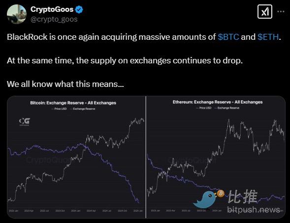 与此同时,CryptoGoos 在其发文中提到,贝莱德(BlackRock) 在近期市场回调期间持续增持 BTC 和 ETH。这一动向与交易所供应量的持续下降相呼应,表明市场对该资产的需求正在逐步增加。