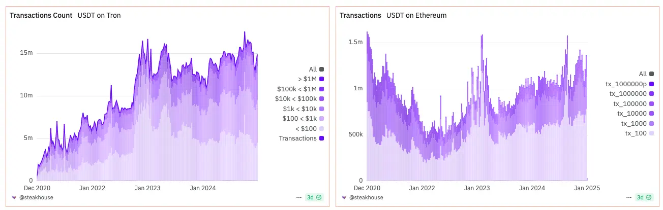 交易量大,那自然收益就多。在收入上,波场(TRON)2024 年的总收入是 21.2 亿美元,单日总收入历史记录达 2166 万美元。在 2025 年新年的第一周,TRON 产生了 4374 万美元的费用,超过了 Ethereum 的 3063 万美元。
