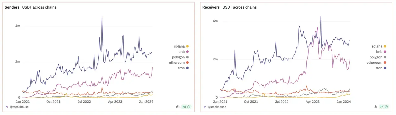 且据区块链数据平台Dune 数据显示,波场 TRON 网络上,不论是 USDT 跨链接收量还是 USDT 跨链发送量,数据都在其他网络之上。波场(TRON)每日的接收和发送量在 700 万美元上下,而 Ethereum 上是 60 万美元上下,差不多是其 11 倍。