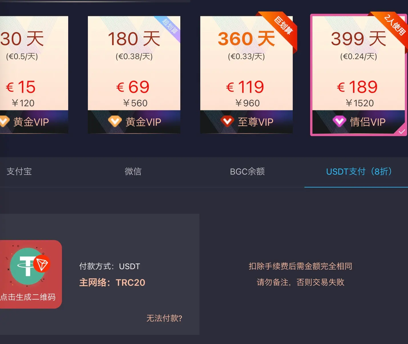 再比如,留学生最爱的盗版视频平台爱壹帆,其会员充值渠道中包含 USDT 支付,而其唯一支持的网络选择就是 TRC-20,这是波场(TRON)网路的 USDT 的代币格式。除了波场(TRON)之外,目前 USDT 共运行在另外多条主流的链上网络。但爱壹帆仅支持 TRON 网路,甚至通过这种方式支付时,官方还提供 8 折优惠。