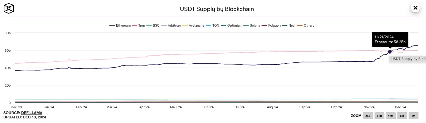 今天,很多 USDT 的转账需求都由波场(TRON)来满足。直到去年 11 月之前,波场(TRON)上的 USDT 发行量都是所有链里面最多的,另一条 USDT 发行量最多的链是 Ethereum。虽然最近 Ethereum 上 USDT 的发行量首次超过了波场(TRON),但数据相差仍不大,仅相差 6 亿美元。