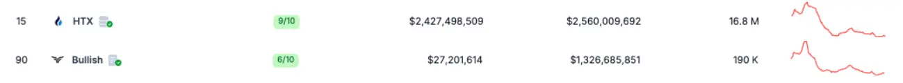 但是客观数据似乎并不能印证广告语,根据 CoinGecko 的数据显示 24 小时内,Bullish 的「正常化交易量」(剔除加密货币交易平台中常见的可疑的 wash trade)日交易量极少超过 4000 万美元,本文撰稿时的 Bullish 24 小时交易量是 2700 万美元,与 Bullish 报告的日均交易量 7 亿美元有较大差距。