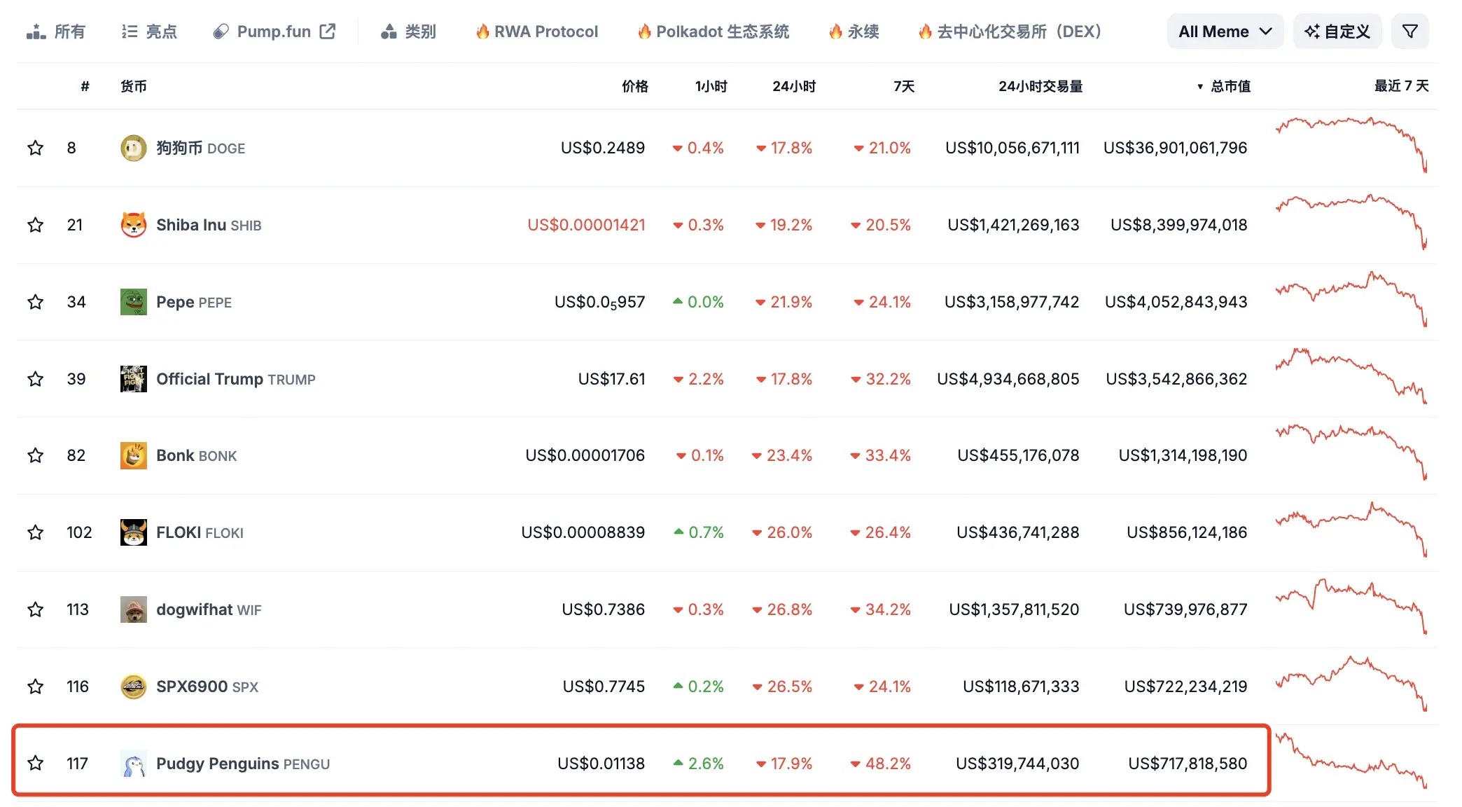 PENGU 代币市值排名 Meme 币赛道第 9 名