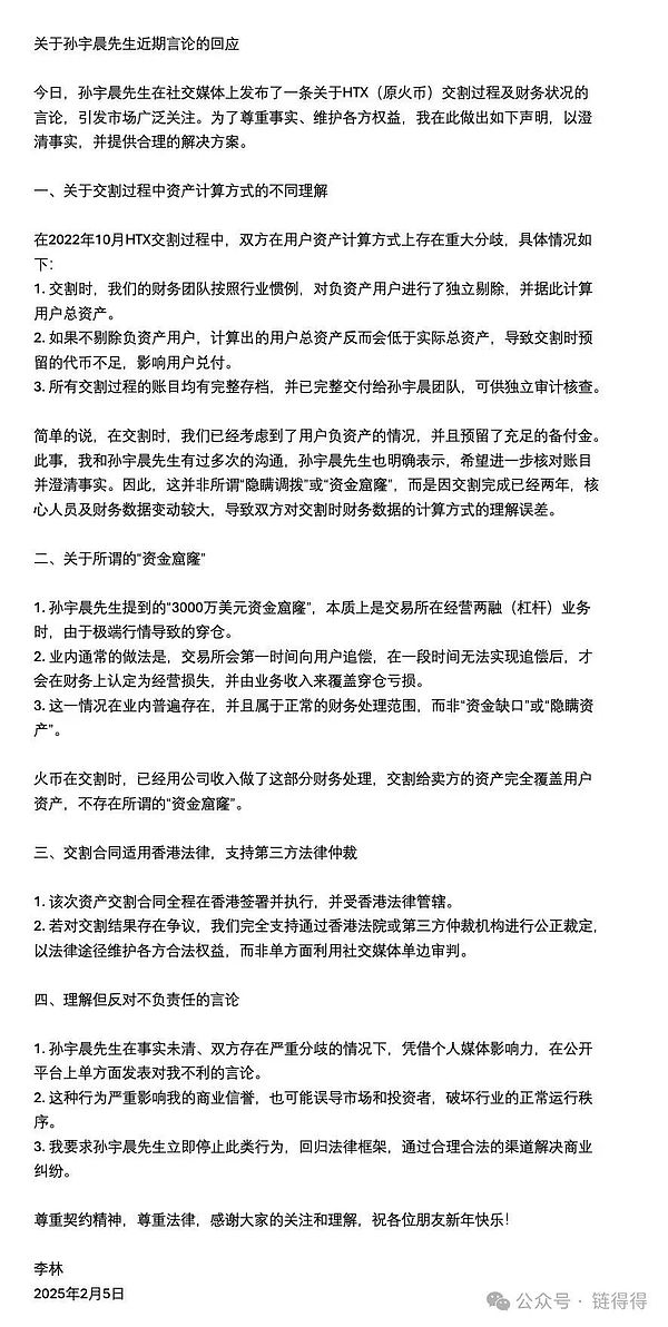 李林则发长文回应称,2022 年 10 月 HTX 交割时双方在用户资产计算方式上存在分歧,孙宇晨提到的“3000 万美元资金窟窿”实为交易所经营两融业务时因极端行情导致的穿仓,且已由公司收入完成财务处理,因此不应被视为一个未被披露的“财务漏洞”。