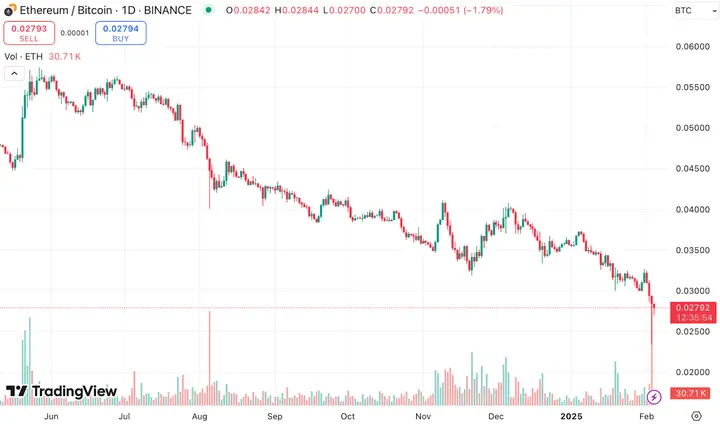截至 2 月 4 日,ETH/BTC 交易对跌至 0.027,创下 2021 年 3 月以来的最低水平。
