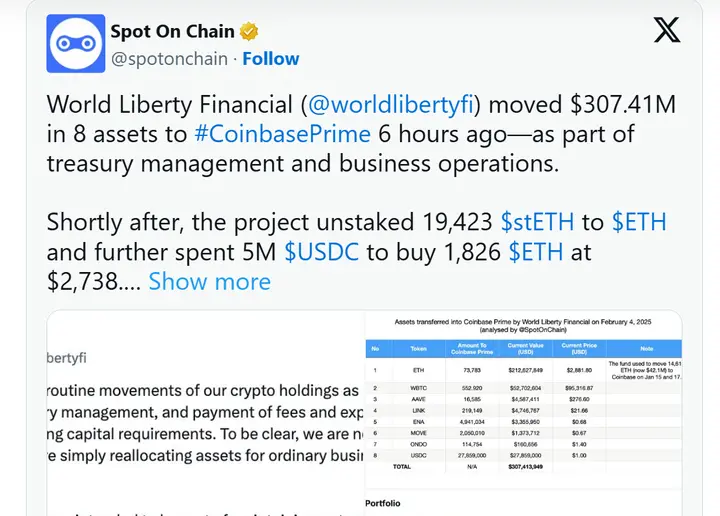 据数据显示,WLFI 已将 307.41 万美元 的 八种资产 转移至 Coinbase Prime,用于 财务管理。这一举动引发市场关注,并可能对以太坊等数字资产的市场情绪产生进一步影响。