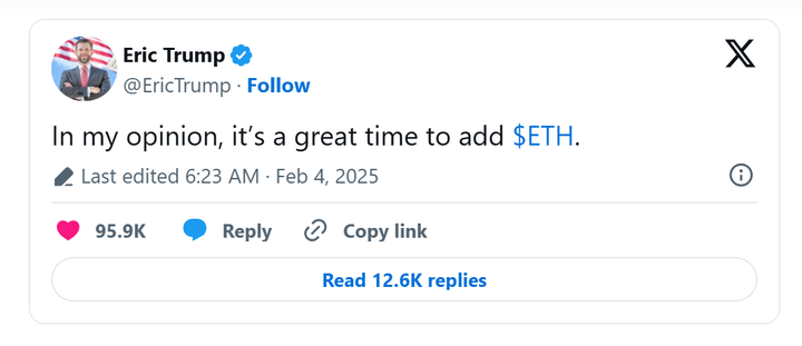 在特朗普宣布 暂停对加拿大和墨西哥的关税 后,ETH 价格短暂触及 $2,900。几乎在同一时间,埃里克·特朗普(Eric Trump) 在 X 上发文称:「在我看来,现在是增持 $ETH 的好时机。」