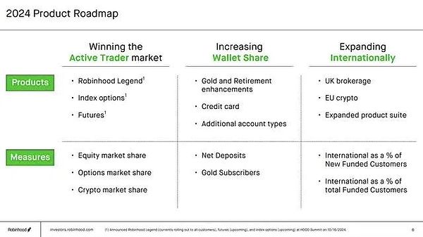 此外,Robinhood 的国际扩张战略特别强调了加密业务的重要性: 欧盟市场:积极布局欧盟加密业务,将其作为国际化的重要支点;英国市场:在伦敦金融城开拓业务,为未来加密服务的扩展奠定基础。