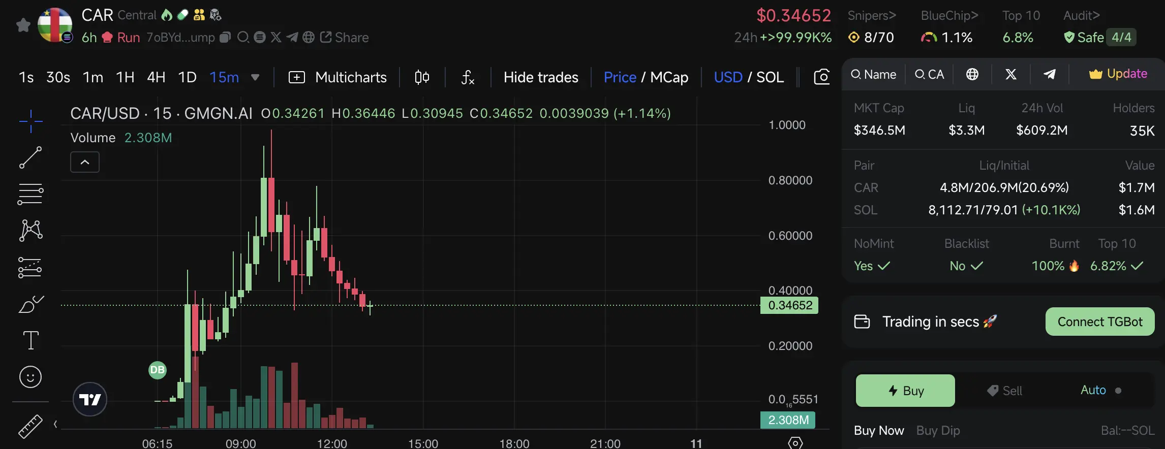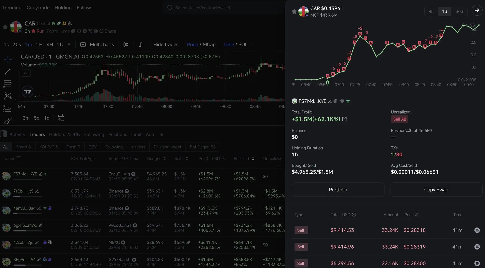 消息一出,CAR 代币价格迅速飙升。链上数据显示,代币市值一度冲高至 7 亿美元,目前稳定在 3 亿美元左右。这场暴涨中,一名交易者在总统发布合约地址的 1 秒内,以 25 枚 SOL(约 5,000 美元)购入 4,657 万枚 CAR,3 小时内部分卖出,总利润超 1,200 万美元,回报率高达 2,450 倍。